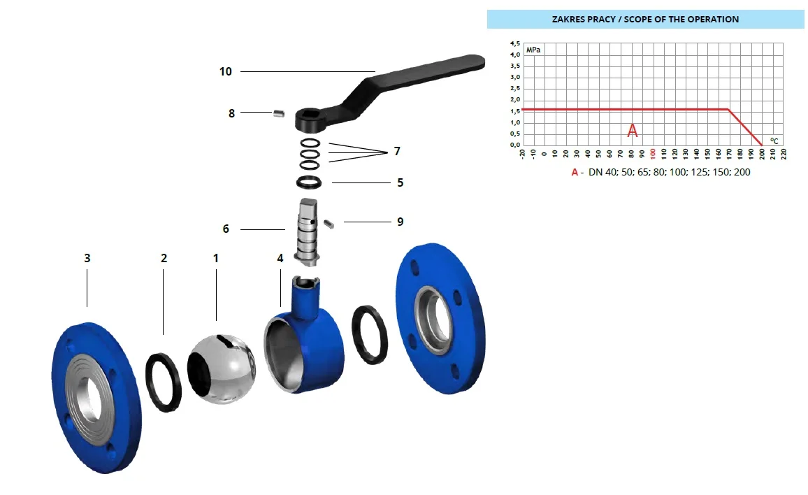 - Uszczelka kulowa – PTFE + 20% węgla (C), temperatura do +200 °C, klasa szczelności A (<0,01 ml/min)