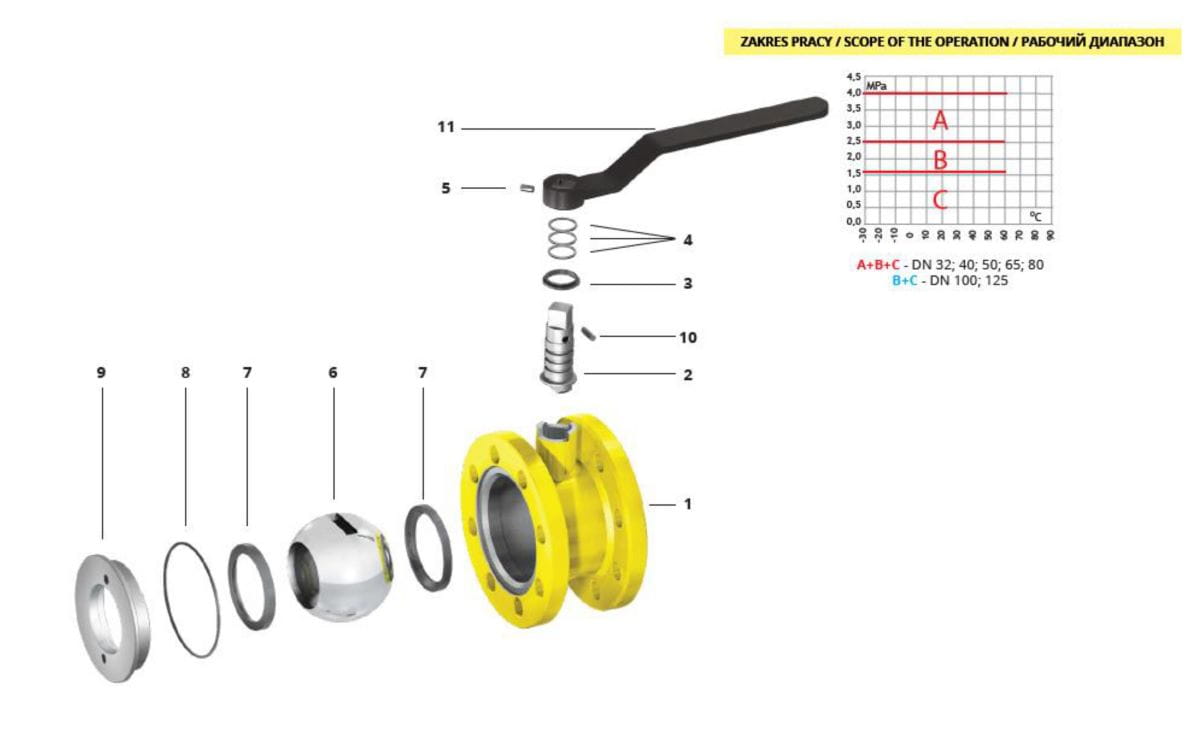Rysunek 1. Konstrukcja zaworu kulowego kołnierzowego do gazu WK2a DN125